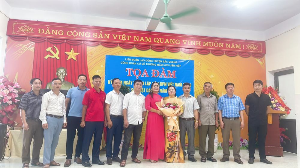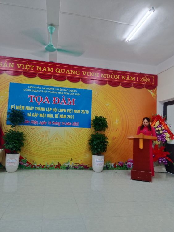 Tại buổi tọa đàm, đồng chí Nông Thị Huê – chủ tịch Công đoàn trường đã ôn lại truyền thống của Hội Liên hiệp Phụ nữ Việt Nam. Hơn 90 năm qua, Hội Liên hiệp phụ nữ Việt Nam ngày càng lớn mạnh. Người phụ nữ Việt Nam ngày càng có tri thức, năng động, sáng tạo, quan tâm tới lợi ích xã hội và cộng đồng, đáp ứng yêu cầu của thời kỳ công nghiệp hóa, hiện đại hóa đất nước và hội nhập quốc tế. Noi gương các thế hệ phụ nữ Việt Nam, nữ công đoàn viên trường Mầm non Liên Hiệp đã luôn phấn đấu hoàn thành xuất sắc nhiệm vụ được giao.