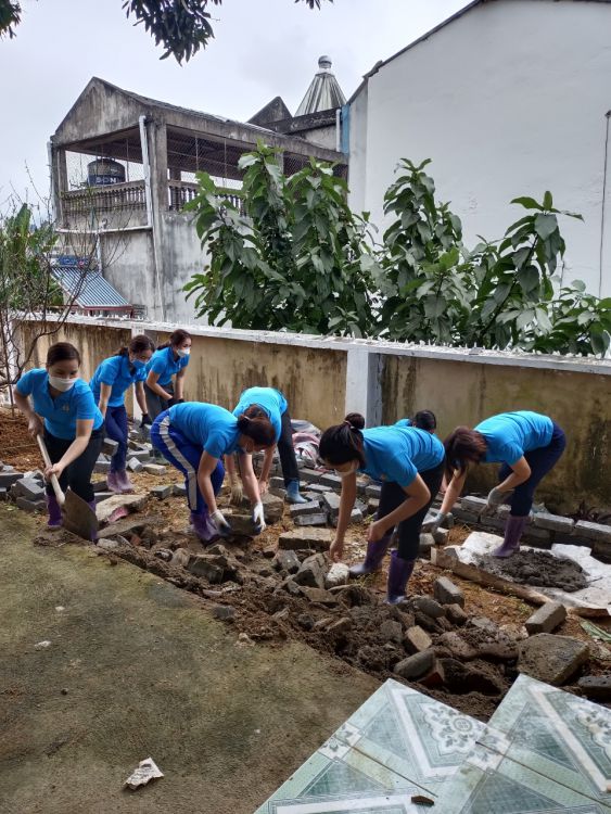 Ảnh 1: Đoàn viên công đoàn trường cùng chỉnh trang, xây dựng khuôn viên nhà trường